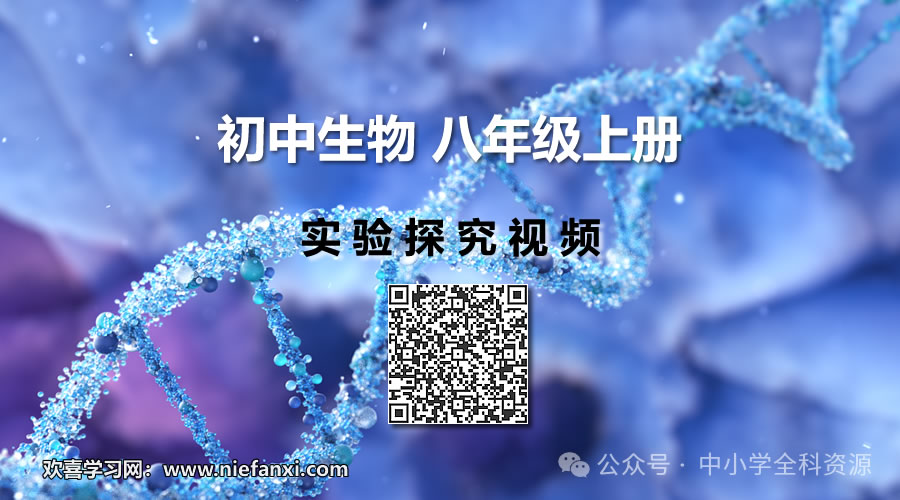 初中生物八年级上册实验探究视频,各地区版本教材实验内容步骤相通,可通用。点击链接或扫描上方二维码订阅在线观看,可打包下载。获取更多学习资源,请关注公众号:中小学全科资源