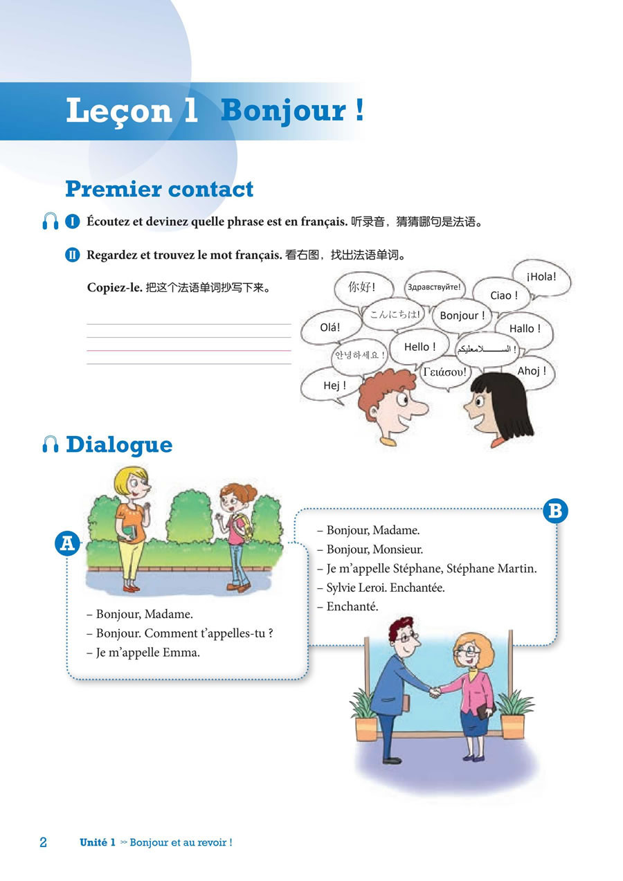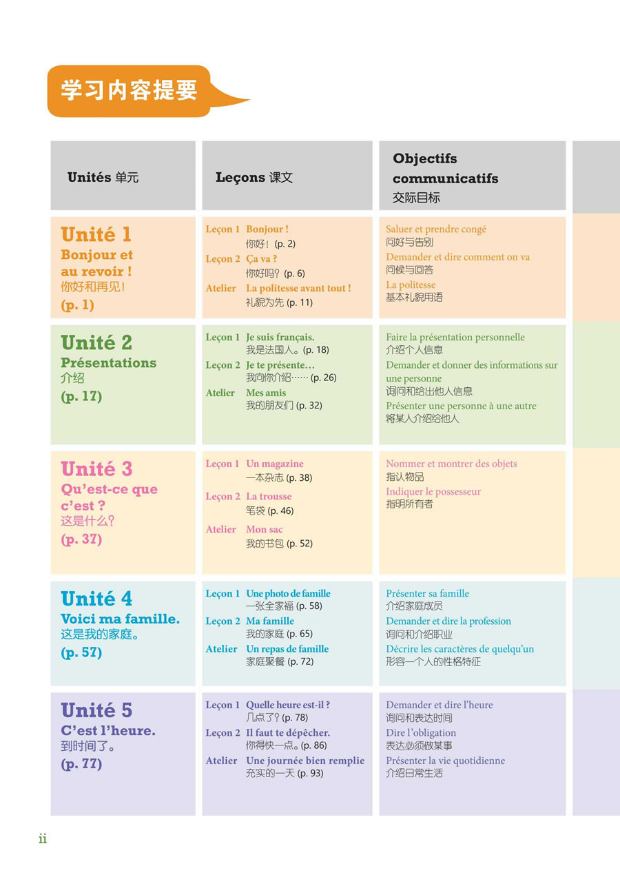 每册教材包括五个单元,每单元由两课和一个“学以致用”模块(Atelier)组成,围绕与校园、家庭和社会生活密切相关的主题展开。每单元第一课和第二课的内容包括四个部分,分别是对话/课文、词汇拓展、语法点滴和交际表达。