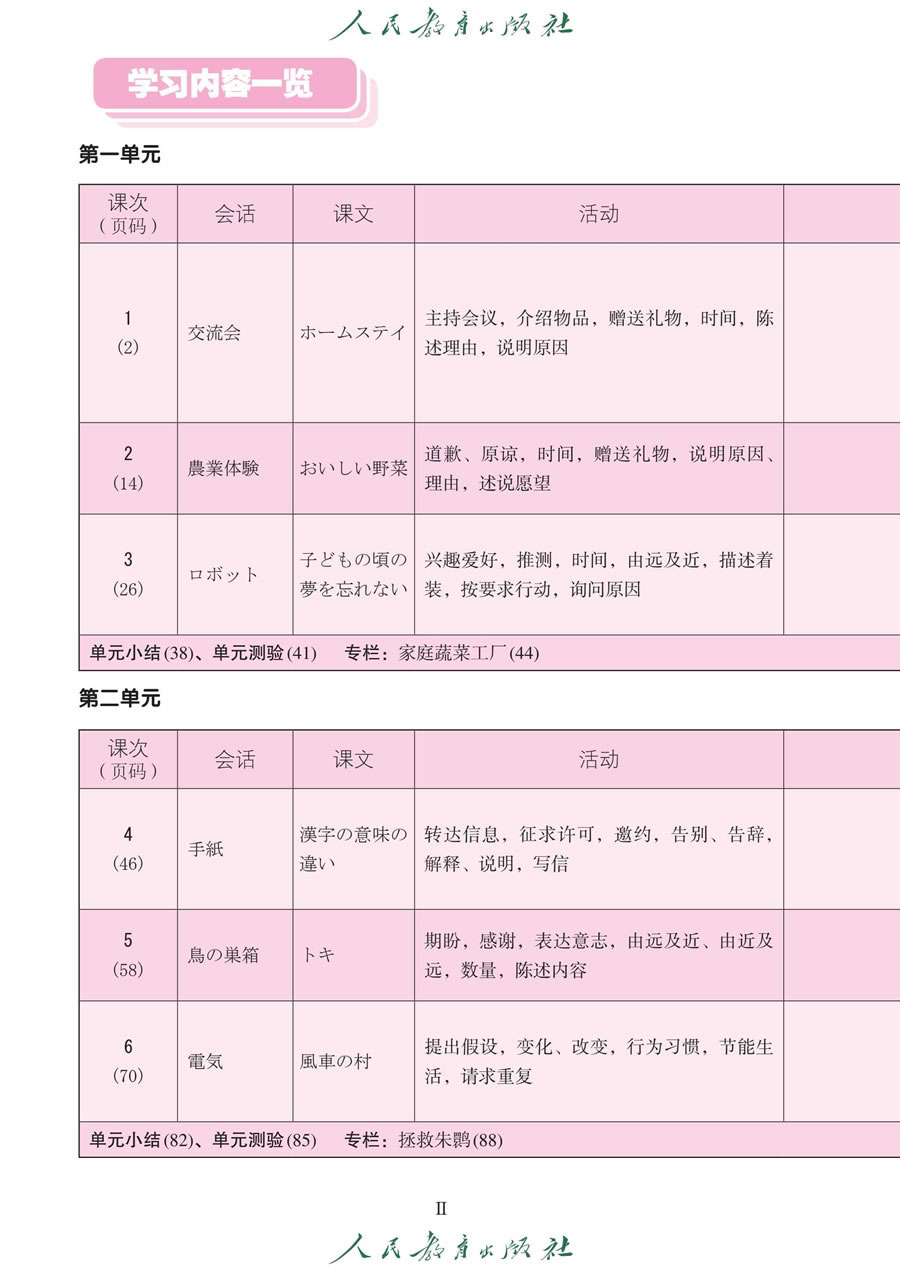 附录包括词汇表、日中汉字对照表、交际与表达一览、语法与表达一览、课外阅读和学习档案。