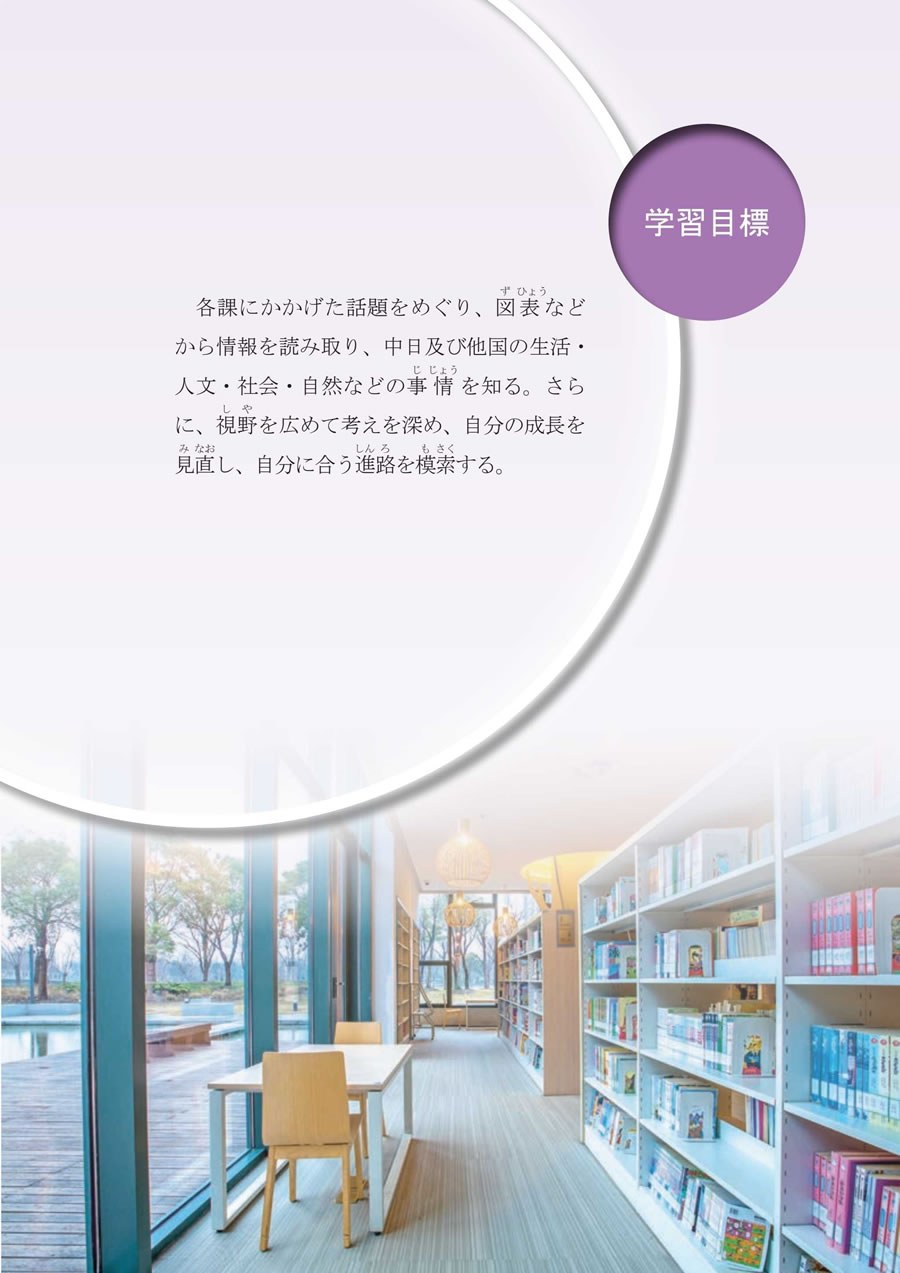 “タイトル”是各课的主题,分别从生活、人文、社会、自然四个不同范畴选取。“目標”描述出同学们围绕不同范畴的主题,应该在各课用日语完成的学习任务。每课均为一次日语实践活动。“ウォーミングアップ”用于激活已有经验,建议同学们认真思考其中的问题并做好学习新课前的准备。“ステップ1”和“ステップ2”是根据该课主题设置的日语实践活动的两个步骤,各课语篇里蕴含着文化背景、学习策略及需要掌握的语法项目等。同学们可以借此开展自主学习、合作学习、探究学习,并在这个过程中获得体验,发现问题、分析问题并加以整合,再通过“やってみよう”尝试解决问题,同时使所学内容得到巩固和提高。