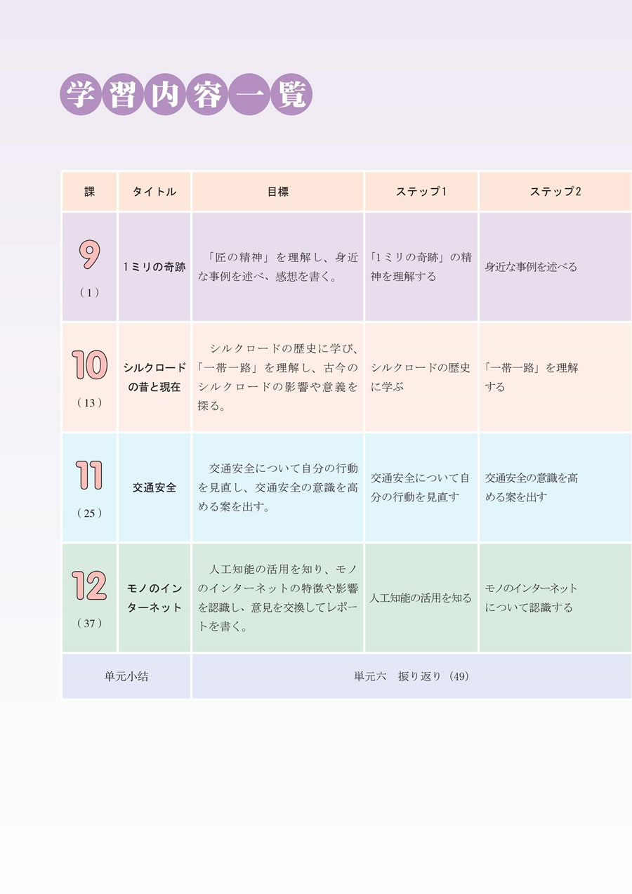 通过书中的“学習内容一覧”,同学们可以查询本单元有哪些需要达到的目标以及学习项目和流程。“主な登場人物”是本套教科书的主要出场人物,既有学生,也有教师,请记住他们的姓名,他们也是同学们的日语学习伙伴!
