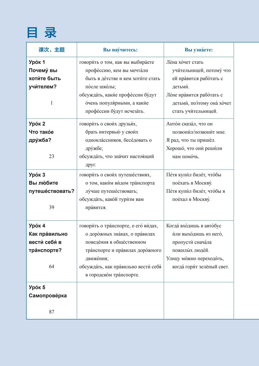 你们好!这本教科书将陪伴你们度过一段美好时光。全书共有五个单元。第一至第四单元分为五个版块:“主题情境导入”“课前活动” “课堂活动” “篇章阅读与思考” “课内课外活动(选学)”。围绕一个主题和若干个语法点,通过对话、短文、讨论、歌曲、看图说话、做游戏和转述等丰富多彩的构件,展开多种活动,培养俄语学科核心素养。其中,“Это на́до знать!” “Это интере́сно!” “Отдохни́те!” 和“课内课外活动(选学)”中的内容供你们选用!第五单元是自我评价,归纳必修阶段学习的主要内容,同时帮助你们对完成必修阶段的俄语学习之后所获得的语言能力、文化意识、思维品质、学习能力等基本核心素养做自我检测和评价。